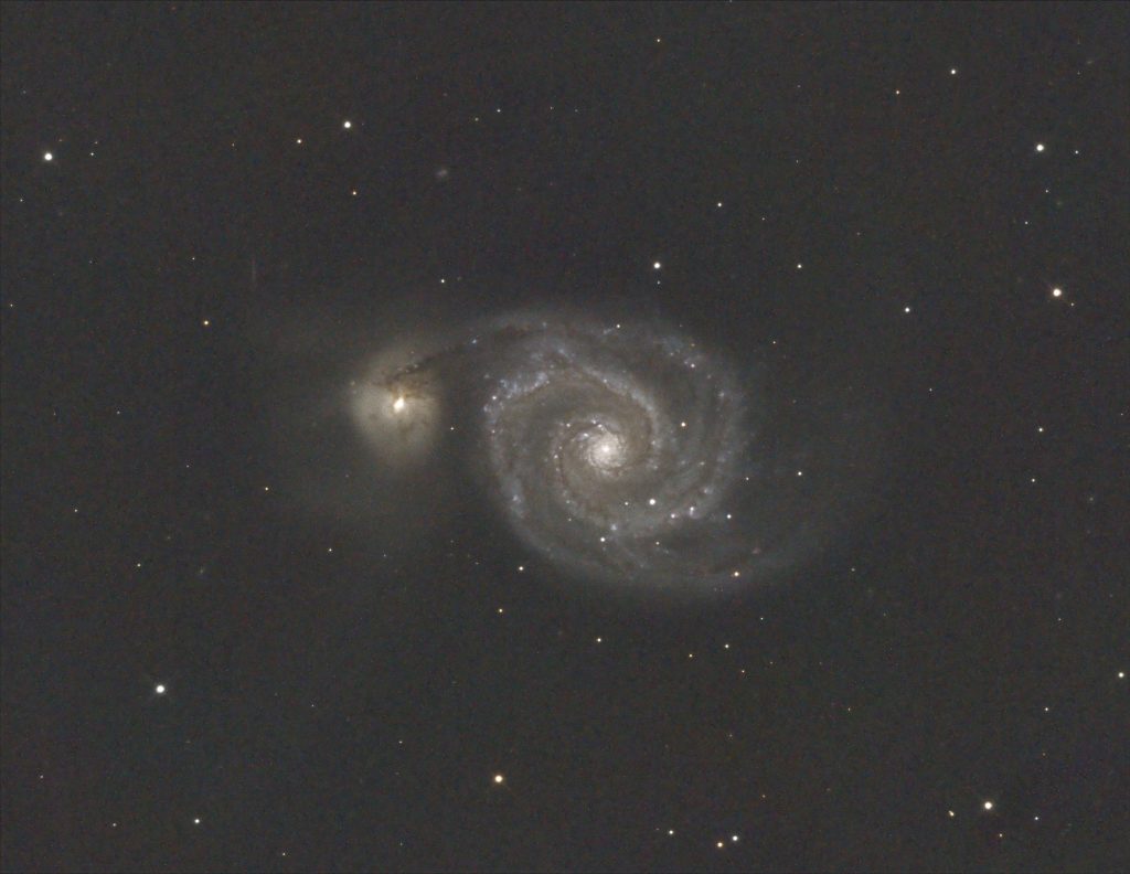 Messier 51, auch bekannt als die Whirlpool-Galaxie, ist eine spektakuläre Spiralgalaxie im Sternbild Jagdhunde. Sie befindet sich etwa 23 Millionen Lichtjahre von der Erde entfernt und ist bekannt für ihre markanten, spiralförmigen Arme, die durch die Wechselwirkung mit ihrer Begleitgalaxie NGC 5195 verstärkt werden. M51 ist ein beliebtes Beobachtungsobjekt für Astronomen und Hobby-Sternengucker aufgrund ihrer Helligkeit und gut sichtbaren Struktur.