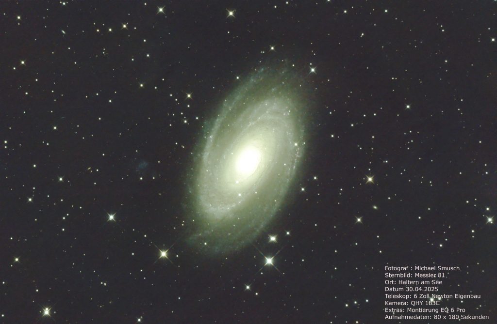 Messier 81, auch bekannt als Bode’s Galaxie, ist eine Spiralgalaxie im Sternbild Großer Bär. Sie befindet sich etwa 12 Millionen Lichtjahre von der Erde entfernt und ist eine der hellsten Galaxien am Nachthimmel, was sie zu einem beliebten Ziel für Amateurastronomen macht. Messier 81 hat eine ausgeprägte Spiralstruktur mit gut definierten Armen und einem großen, hellen Kern, der von einer Ansammlung alter Sterne dominiert wird. Die Galaxie ist Teil der M81-Gruppe, einer kleinen Galaxiengruppe, zu der auch Messier 82 gehört. Aufgrund ihrer relativen Nähe und Helligkeit wird Messier 81 häufig verwendet, um die Eigenschaften von Spiralgalaxien und deren Sternentstehungsprozesse zu untersuchen.