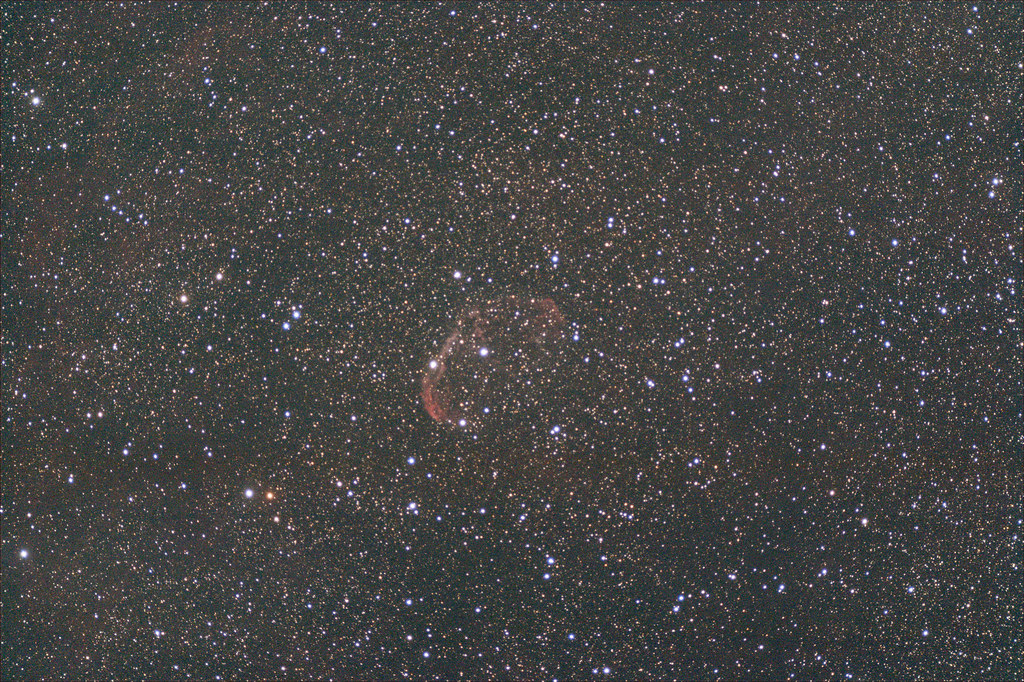 NGC 6888, auch bekannt als der Crescent-Nebel oder Sichelnebel, ist ein planetarischer Nebel im Sternbild Schwan. Er befindet sich etwa 5.000 Lichtjahre von der Erde entfernt. Der Nebel entstand durch die starken Winde eines Wolf-Rayet-Sterns, der Material in den Weltraum schleudert und dabei eine komplexe Hülle aus Gas und Staub bildet. NGC 6888 ist besonders bekannt für seine leuchtenden roten und grünen Farben, die durch ionisiertes Wasserstoff- und Sauerstoffgas verursacht werden. Er ist ein beliebtes Beobachtungsobjekt für Amateurastronomen und bietet faszinierende Einblicke in die späten Entwicklungsstadien massereicher Sterne.