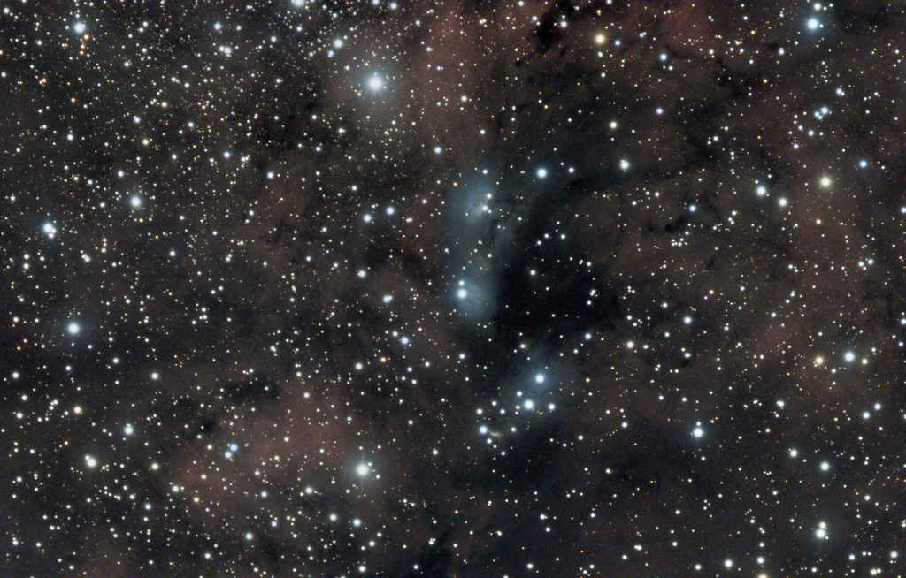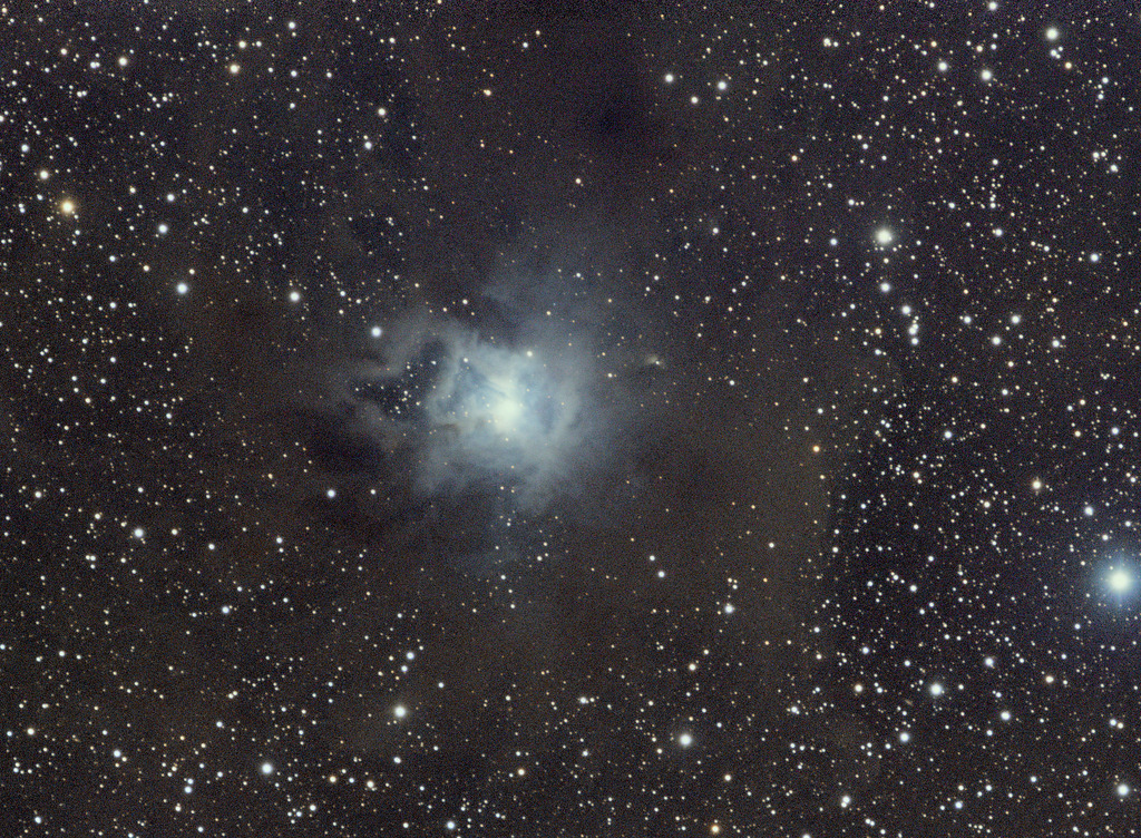 Der NGC 7023, auch bekannt als Irisnebel, ist ein heller Reflexionsnebel im Sternbild Kepheus. Er befindet sich etwa 1.300 Lichtjahre von der Erde entfernt und ist für seine auffälligen blauen Reflexionen bekannt, die durch das von jungen, heißen Sternen reflektierte Sternenlicht entstehen. Der Nebel ist Teil eines größeren Molekülwolkenkomplexes und ein beliebtes Ziel für Amateurastronomen aufgrund seiner Schönheit und Helligkeit. Die zentrale Region des NGC 7023 enthält einen jungen Stern, der das umgebende Gas und Staub zum Leuchten anregt. Der Irisnebel bietet wertvolle Einblicke in die Prozesse der Sternentstehung und die Wechselwirkung von Sternen mit ihrer Umgebung.