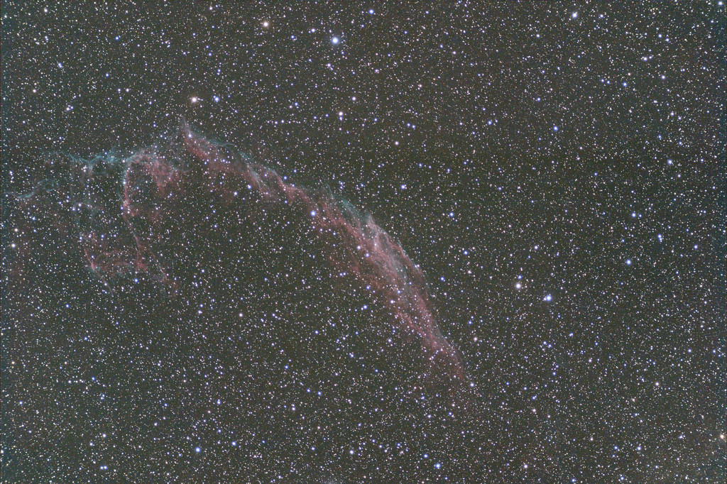 NGC 6992 ist ein Teil des Cirrusnebels, eines großen Supernova-Überrests im Sternbild Schwan. Dieser Nebel entstand vor etwa 8000 Jahren durch die Explosion einer massereichen Sterns. NGC 6992 zeichnet sich durch seine filigranen, leuchtenden Gasstrukturen aus, die durch die Schockwellen der Supernova aufgeheizt wurden. Das Objekt ist ein beliebtes Ziel für Amateurastronomen und beeindruckt durch seine komplexen, wolkenartigen Formen und die vielfältigen Farben, die durch verschiedene ionisierte Gase erzeugt werden.
