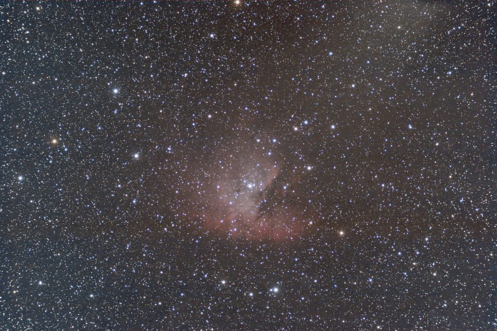 NGC 281, auch bekannt als der Pacman-Nebel, ist ein Emissionsnebel im Sternbild Kassiopeia. Er befindet sich etwa 9.500 Lichtjahre von der Erde entfernt und ist Teil einer großen Sternentstehungsregion. Der Nebel enthält junge, heiße Sterne, die das umgebende Gas zum Leuchten anregen. Besonders auffällig ist seine Form, die an die Figur des Videospiel-Charakters Pacman erinnert, was ihm seinen Spitznamen eingebracht hat. NGC 281 ist ein beliebtes Beobachtungsobjekt für Hobbyastronomen und bietet faszinierende Einblicke in Prozesse der Sternentstehung.