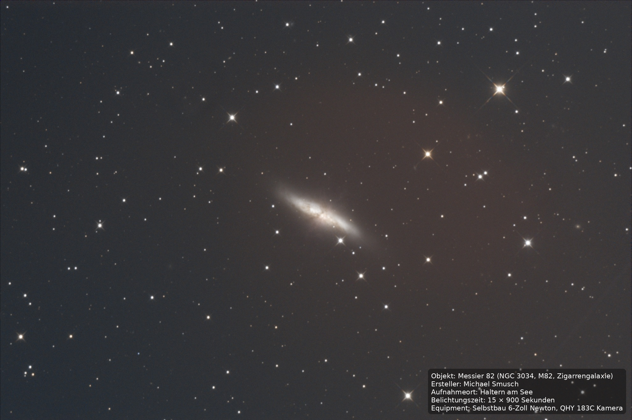 Messier 82, auch bekannt als die Zigarrengalaxie, ist eine starre, irreguläre Galaxie im Sternbild Großer Bär. Sie befindet sich etwa 12 Millionen Lichtjahre von der Erde entfernt und ist besonders bekannt für ihre intensive Sternentstehungsaktivität, weshalb sie als Starburst-Galaxie bezeichnet wird.
